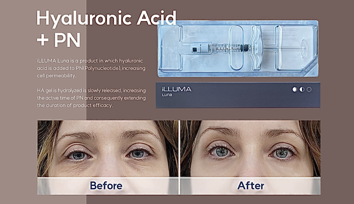 ILLUMA LUNA, cutting-edge PN (Polynucleotide) skin booster, stands out as a remarkable solution specifically designed for the delicate under-eye area. This innovative and advanced product combines the benefits of hyaluronic acid with PN, enhancing cell permeability and promoting a gradual release of HA gel. The slow release extends the active time of PN, thereby amplifying the product’s overall effectiveness.